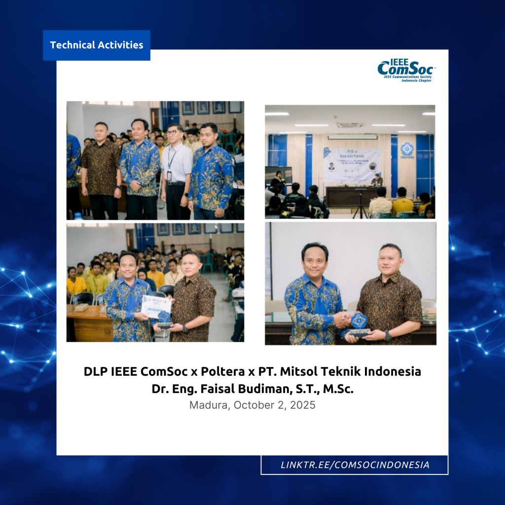 The IEEE Communications Society (ComSoc) Indonesia Chapter, in collaboration with the Jurusan Teknik Elektro (JTE) at Politeknik Negeri Madura (Poltera) and PT Mitsol Teknik Indonesia, successfully held a guest lecture on Thursday, October 2, 2025, at the Meeting Room in Building B of Poltera. The event was attended by faculty members and students from various cohorts, demonstrating high enthusiasm in efforts to strengthen vocational education aligned with current industry needs.